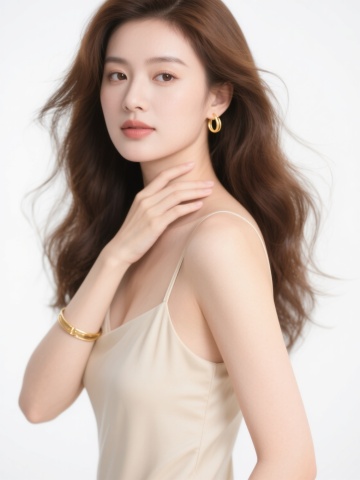高清晰度商业人像摄影,柔和明亮的光线,细腻自然的肤色质感,棕色长卷发自然垂落,部分发丝轻盈飘动,身着浅米色简约吊带,佩戴金色细圈耳环和金色细手镯,半身构图,女性侧身站立,一手轻抚颈部,另一手自然下垂,眼神温柔望向镜头,背景为纯白色,整体呈现清新、优雅、纯净的氛围,画面简洁干净,突出人物主体。