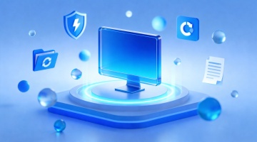 未来感科技蓝调,3D玻璃风设计,清透光影与体积感交织,轻拟物图标环绕,展现数字安全与数据流转的动态场景。