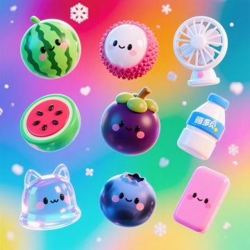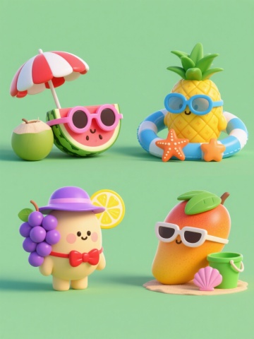 3D风格的卡通水果,拟人化设计,塑料质感,色彩鲜艳,充满可爱感。
