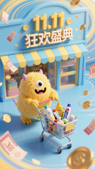 软3D风微缩艺术场景,毛茸茸卡通怪兽推购物车,满载日用品,金币与优惠券飞舞,营造可爱喜庆的双十一促销氛围。