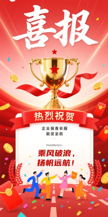 主标题为“欣报喜讯”二字,流动的金色笔触,文字竖向排列,深红色背景。图片比例1:1。