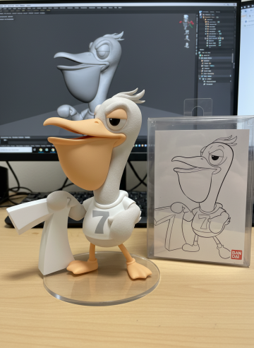将这个图片制作成一个商业化1/7比例手办,风格写实,环境逼真。手办放置在电脑桌上,配有一个圆形透明亚克力底座,底座上没有文字。电脑屏幕上显示着手办的Zbrush建模过程。电脑屏幕旁边是一个万代风格的透明玩具盒,上面印有原始画作。