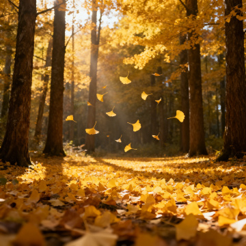 户外场景,印象派风格,画面以浓郁的金黄色调为主,温暖的午后阳光透过茂密的枫树林洒下斑驳光影,地面覆盖着厚厚的橙红色落叶,远处是连绵起伏的丘陵,天空呈现出柔和的橘粉色晚霞,空气中漂浮着轻盈的落叶,整体氛围宁静而富有诗意,展现出秋日森林的绚烂与静谧之美