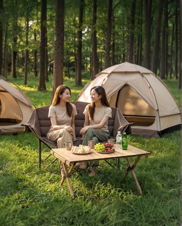阳光透过茂密的绿色树叶洒下斑驳光影,在开阔的绿色草地上,布置着一个米色帆布帐篷和一个带遮阳棚的露营帐篷,帐篷周围摆放着原木色折叠桌椅,桌上铺着格纹餐布,旁边散落着几个彩色靠垫和一本翻开的书,整体呈现出自然、宁静、舒适的户外露营氛围,高清晰度,写实风格,温暖色调,柔和光线,丰富的细节纹理。