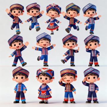 软3D粘土风卡通角色,身着民族服饰,萌趣可爱,喜庆氛围浓厚,融合传统元素与现代设计,节日感十足。