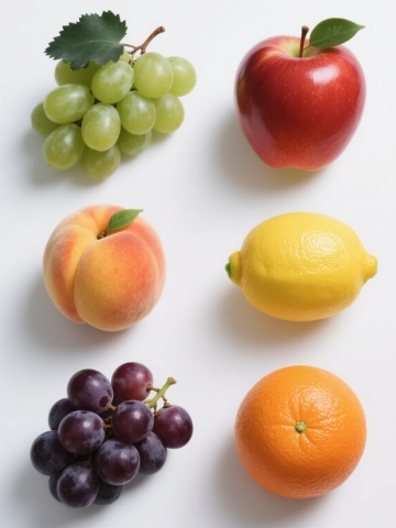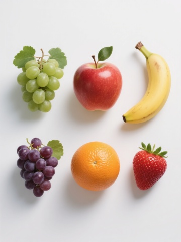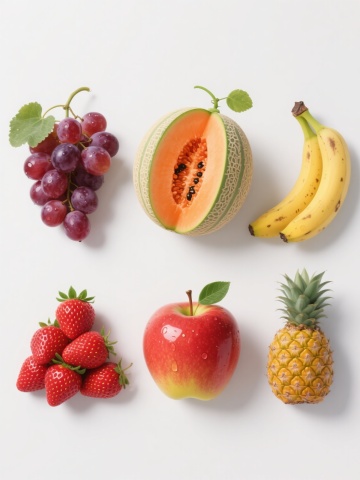 白色纯色背景上,以超写实主义风格呈现的6个完全不同的水果元素系列素材集合,每个元素均保持与原图一致的高细节质感、水润光泽表现、自然光影处理和规整排布方式:1. 一串饱满的红提,紫红色果皮带有光泽和水珠,附带绿色叶子和藤蔓;2. 一个完整的哈密瓜,橙黄色果皮带有绿色条纹,切开一半露出橙红色果肉和黑色种子;3. 一串香蕉,黄色果皮带有褐色斑点,自然弯曲的形态,顶部保留绿色果柄;4. 一个苹果,红色果皮带有黄色渐变,表面光滑有光泽,附带一片绿色叶子;5. 一串草莓,红色果肉表面布满黄色种子,顶部带有绿色草莓叶,呈现自然堆叠状态;6. 一个菠萝,黄色果皮带有菱形鳞片和绿色叶子,表面纹理清晰可见。所有元素均保持相同的光影方向、细节刻画程度和水润质感,整体布局规整对称,形成统一协调的水果系列素材集合。