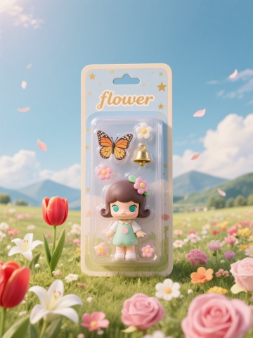 软3D风卡通女孩玩偶,拟人化设计搭配蝴蝶与铃铛,置于花海背景中,呈现甜美可爱、清新梦幻的春季氛围。