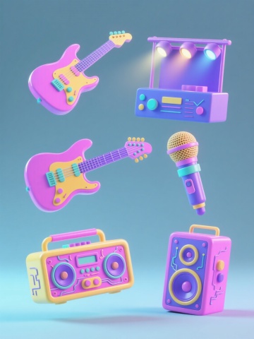一套6张系列素材集合,每张素材均为规整排布的单一元素图案,保持简约现代的3D卡通风格,采用纯色背景,无任何文字、logo及水印。整体造型圆润可爱,具有光滑的塑料质感和柔和的光影效果,高光与阴影过渡自然,物体边缘有轻微的模糊处理以增强立体感。每张素材中改变喇叭的造型设计和颜色,喇叭主体为不同颜色的圆润扩音筒,搭配黄色的喇叭嘴和手柄,带有卡通化的眼睛和表情,以及黄色的声波线条从喇叭口向外扩散,保持统一的构图和视觉风格。