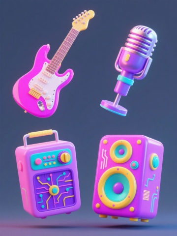 6个不同配色、不同样式、不同材质的「喇叭」造型,采用上下两行对齐排列,每个喇叭都具有3D立体效果,表面呈现出金属光泽与渐变色彩的质感,搭配闪电、云朵等活泼的装饰元素,整体置于浅色背景上,营造出鲜明的促销氛围,视觉层次分明,信息传达高效,符合促销活动的视觉需求。