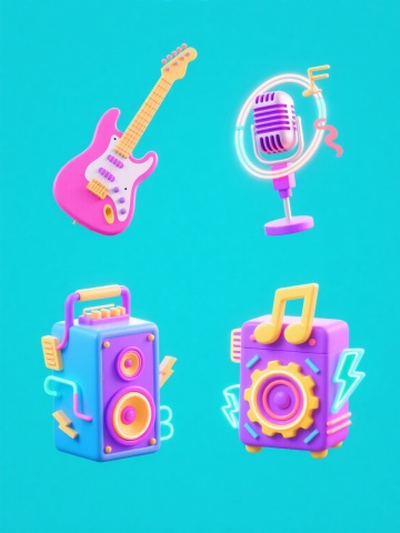 一套6张的系列素材集合,每张素材均为规整排布的单一元素图案,风格简约现代,采用纯色背景,无任何文字、logo及水印。核心元素为造型各异的卡通风格喇叭,保持3D立体效果,表面光滑圆润,带有柔和高光与轻微阴影,具有Q版可爱的特征,如圆形或椭圆形的眼睛、简洁的表情线条,以及从喇叭口发出的橙黄色声波图案;每张素材中的喇叭在造型设计(如喇叭口形状、手柄样式、整体比例)和颜色搭配(主体颜色及喇叭口、手柄、声波等细节颜色)上进行变化,保持整体视觉统一性与系列感。