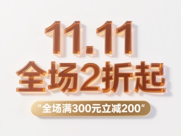 3D玻璃质感大字设计,金色透明材质强化体积感,突出双十一促销信息,简洁现代风格传递强烈优惠氛围。