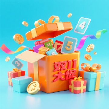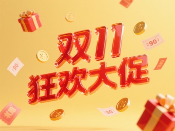 软3D风格的双11促销海报,卡通感十足,色彩鲜艳,礼物盒与金币飞溅,营造出喜庆膨胀的节日氛围,强化促销感与视觉冲击力。