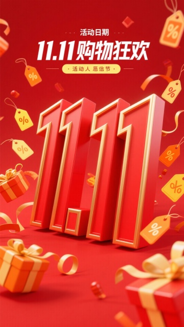 3D金属鎏金风大字设计,搭配红金礼盒与丝带,营造喜庆促销氛围,突出双十一节日狂欢感与体积感。