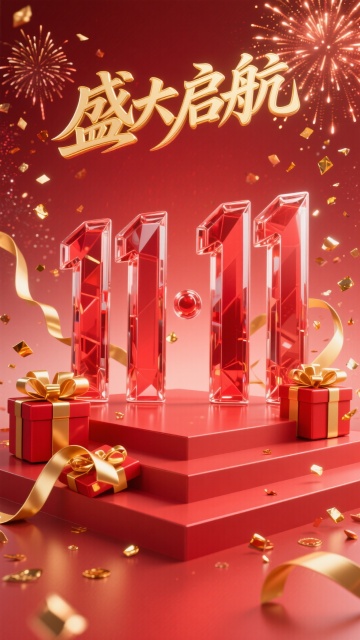 3D大字风结合霓虹灯质感,塑料光泽突出体积感,红金配色强化喜庆与促销氛围,飘带礼盒金币环绕,营造双十一狂欢节的视觉盛宴。