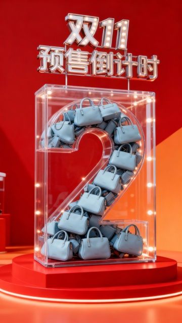 3D微缩艺术风呈现双十一抢购盛宴,鎏金与金属质感结合卡通人物,营造喜庆促销氛围,倒计时数字强化紧迫感。