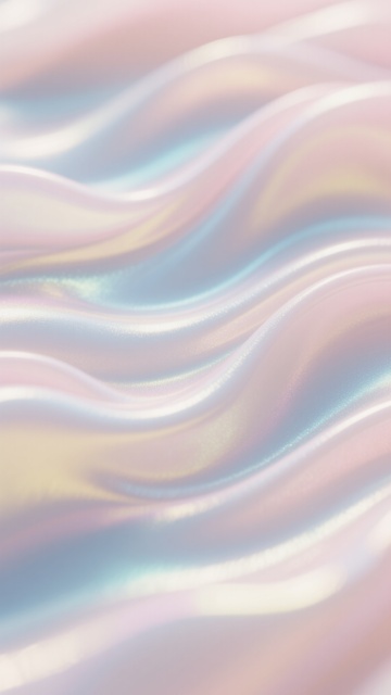 柔和流动的波浪状纹理,以粉白色为基调,融合淡蓝色和淡黄色的渐变色彩,呈现出细腻温润的珠光质感,整体画面轻盈通透,带有柔和的光泽感和丝绸般的顺滑触感,色彩过渡自然,光影柔和,营造出宁静梦幻的氛围。