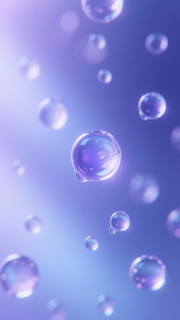 纯净透明的水珠与气泡悬浮在半空中,背景呈现柔和的蓝紫色渐变光线效果,水珠表面折射出梦幻的蓝紫色光泽,整体画面通透轻盈,充满清新梦幻的氛围,光线色彩以蓝紫色调为主,营造出宁静而神秘的视觉感受,水珠大小不一、分布自然,具有细腻的质感和清晰的轮廓,背景虚化处理增强了空间感和层次感。