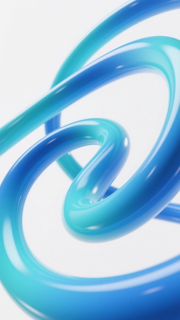 白色背景上,由明亮的蓝色和青色渐变线条构成的动感流体形态,线条呈现出光滑的3D质感,具有强烈的光泽感和反光效果,曲线相互交织缠绕,形成螺旋上升的动态构图,整体画面简洁现代,充满科技感和流动的韵律美,没有文字和其他元素干扰。