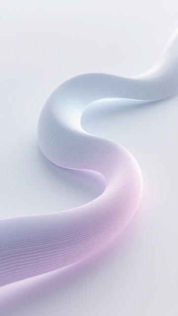 极简主义风格3D渲染海报,画面主体为流畅飘逸的波浪形曲面,表面覆盖细腻的网格纹理,柔和的漫反射光源从画面右侧上方照射,形成自然的光影过渡和轻微的高光反射,整体色调采用低饱和度的渐变配色,从浅灰蓝过渡到淡紫粉色,曲面底部带有细密的横向线条纹理增强质感,背景为纯净的渐变白色,营造出宁静、科技感与优雅并存的氛围,整体构图遵循三分法原则,视觉焦点集中在波浪曲线的交汇点,设计简洁现代,信息传达高效,符合高端科技产品或艺术展览的宣传需求,具有强烈的视觉冲击力和现代设计感。