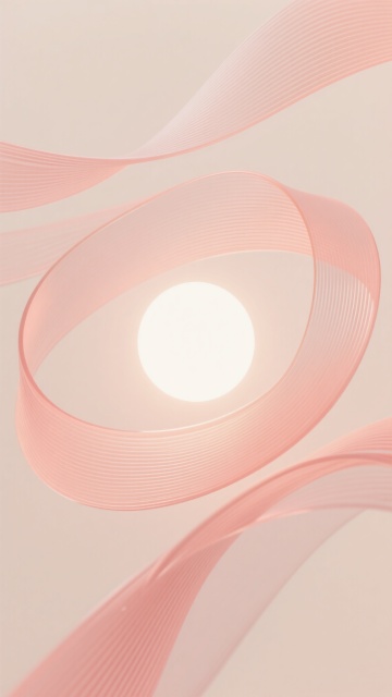 简约现代风格的3D抽象背景,以柔和的珊瑚粉色与淡奶油色为主色调,呈现出流畅弯曲的带状结构,这些带状物表面带有细密平行的纹理线条,整体呈现出轻盈通透的半透明质感。画面中央有一个明亮的圆形光晕区域,光线从中心向外柔和扩散,营造出宁静、空灵且温暖的氛围。构图采用曲线动态平衡布局,背景简洁干净,无任何文字或logo元素,光线过渡自然,阴影细腻柔和,整体设计具有高度的视觉统一性和简约高级的质感。