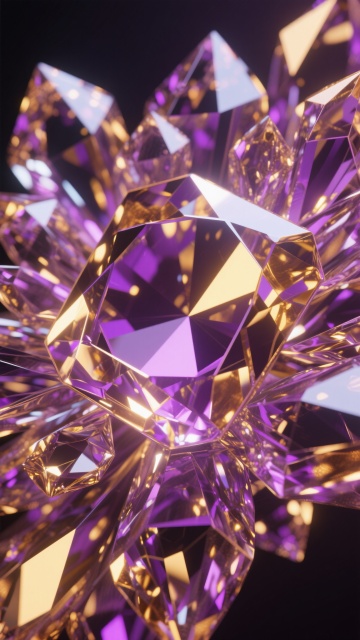 一张以深邃紫色和璀璨金色为主色调的3D渲染钻石晶体特写,无数棱角分明的透明切割面折射出强烈的金色高光和紫色光晕,内部结构清晰可见,光线在晶体间多重反射形成梦幻的光斑效果,整体呈现出奢华、神秘而又极具未来感的视觉氛围,高分辨率,超写实质感,细节丰富。