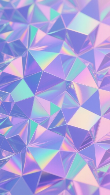 梦幻感十足的镭射质感背景,由大量不规则多边形几何色块组成,整体呈现出以蓝紫色为基调,融合粉绿、淡金、幻彩等光泽的渐变色彩效果,每个多边形色块边缘锐利清晰,表面反射着如同彩虹般流动变幻的镭射光芒,光影交织形成微妙的明暗对比,整体画面充满未来感与神秘感,色彩和谐且富有层次,营造出绚丽而朦胧的梦幻氛围。