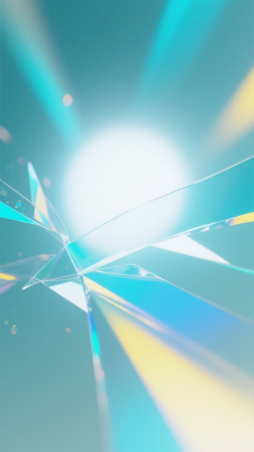 梦幻渐变背景,整体呈现柔和的蓝绿色调,中央有明亮的白光扩散,边缘带有青蓝色和柠檬黄的光晕效果,光线呈现出锐利的线性光束和柔和的漫射光斑交织,透明质感的几何碎片在光线下折射出微妙的色彩变化,整体画面通透、轻盈,充满空灵而宁静的氛围,色彩过渡自然平滑,高光区域明亮但不过曝,暗部保留细腻的渐变层次。