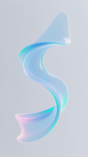 极简风格流体艺术,纯净白色纯色背景,主体为变换造型的流光线条,以灵动飘逸的曲线构成新的整体样式,线条呈现半透明的淡蓝色调,内部点缀细密的蓝色光点,边缘带有蓝绿色与淡粉色渐变的流光效果,光影柔和,高光细腻,整体营造出轻盈、梦幻、科技感的氛围,画面简洁大气,视觉焦点突出。