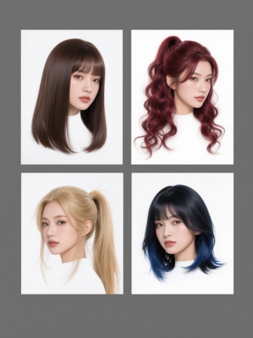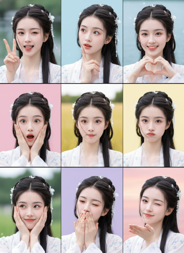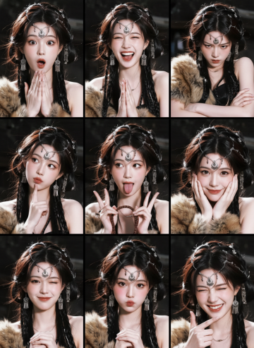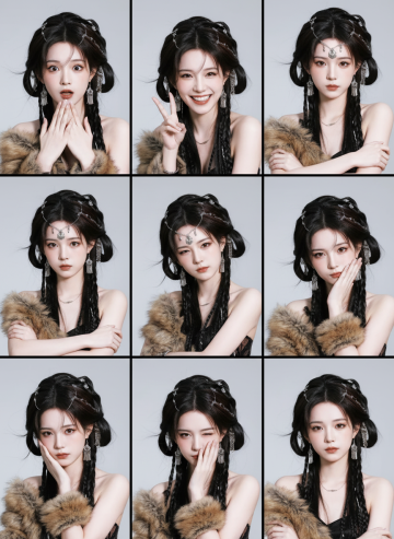 国潮风与工笔风融合,复古中式造型搭配鎏金发饰,九宫格展现灵动表情,光影细腻,优雅中透出趣味感与梦幻氛围。
