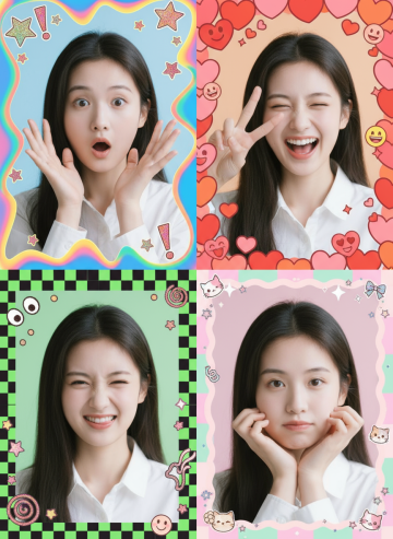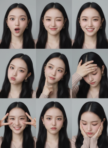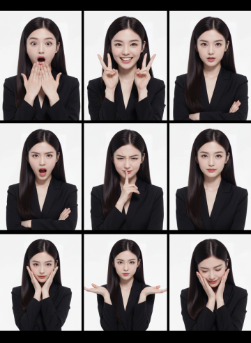 保持人物主体不变,创作一组写实风格表情包,包含表情不同、姿势不同的九宫格表情包