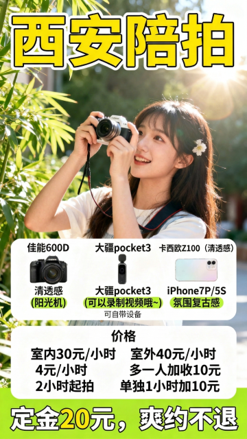 超大标题居中“吃在柳州”(文字花字设计带有柳州元素),一个少女拿着相机文字下方,写实人像,人像周围有描边,手账拼贴风