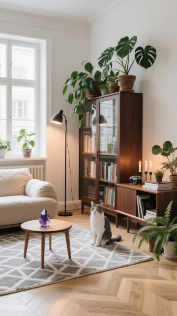 一位年轻的外国美女,有着金色卷发和蓝色眼睛,穿着舒适的家居服,正温柔地抚摸一只白色猫咪,猫咪活泼地在灰色方形绒面猫窝里玩耍,猫窝放在铺着浅色毛绒地毯的房间里,阳光透过窗户洒进来,营造温馨氛围,产品为灰色方形绒面猫窝
