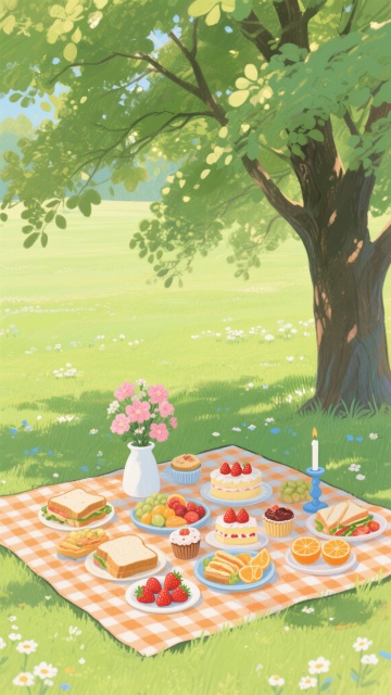 俯视视角下,一片被红、橙、黄三色秋叶覆盖的山坡草地,草地中错落分布着几棵矮树,树旁有一块铺着复古花纹餐布的野餐地,餐布上摆着枫糖松饼、汉堡、可颂与冒着热气的陶罐;午后阳光从树顶洒下,在草地、餐布与秋叶上投下星星点点的暖光斑,几片叶子从树隙间飘向野餐布,整体构图温馨治愈,暖调里满是秋日野餐的闲适慵懒感。