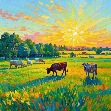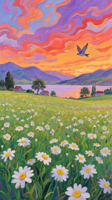 【秋季】远景镜头,琥珀色的水彩幻化成轻盈的纱幔铺展背景,金黄、橙红与赭石色的枫叶、银杏叶交织飘落,其间点缀着米白的雏菊与深紫的秋菊,晨雾凝结的露珠泛着冷光,夕阳透过疏朗枝叶洒下暖橙光斑,色调以琥珀金为主,融合橙红与赭石,呈现秋日成熟的诗意童话。