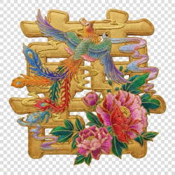 清朝常用云肩款式,中心为红色“喜”字刺绣,周围环绕细腻云纹、葫芦、蝙蝠、牡丹、卷草纹传统纹样,高饱和度红色、粉色、绿色、青花蓝色与金色丝线交织,刺绣质感细腻,丝线光泽感强,针脚立体感清晰可见,所有元素规整排布在纯白色背景上,整体构图平衡对称,展现精致典雅的东方美学韵味