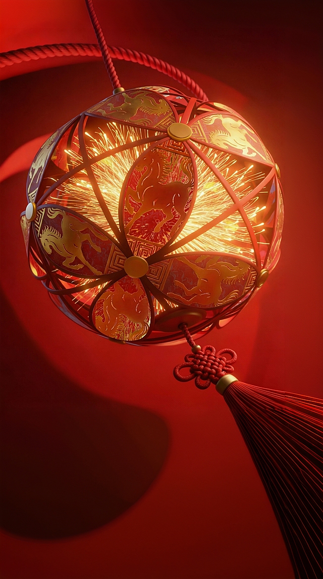 鎏金灯笼悬于渐变红背景,融合扁平与轻拟物设计,点缀星形与烟花元素,尽显中式喜庆氛围。详情
