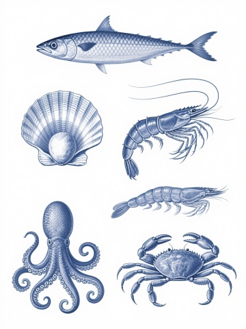 Set of 6 distinct seafood illustrations in detailed blue line art style on pure white background, featuring meticulously hand-drawn crustaceans and fish with precise cross-hatching and stippling techniques, including: 1) Side-facing mackerel with textured scales and fin details, 2) Detailed sea scallop with visible shell ridges and inner muscle, 3) Lateral view of spiny lobster with segmented antennae, 4) Swimming shrimp in mid-motion with curved abdomen, 5) Octopus with coiled tentacles and suckers, 6) Dungeness crab with extended pincers, arranged in clean 2x3 grid layout with consistent spacing, maintaining scientific illustration precision and vintage engraving aesthetic, no text or logos, isolated elements with fine line weights and organic texture rendering.