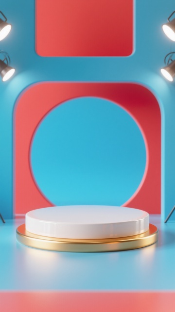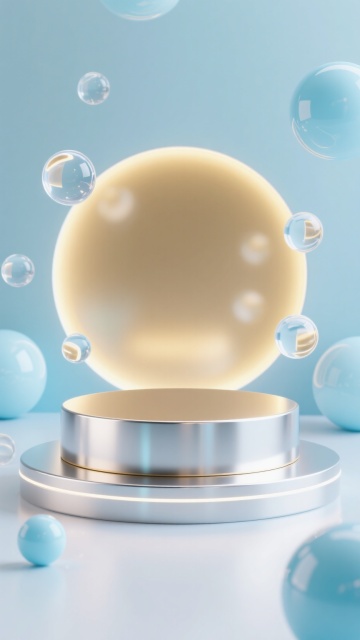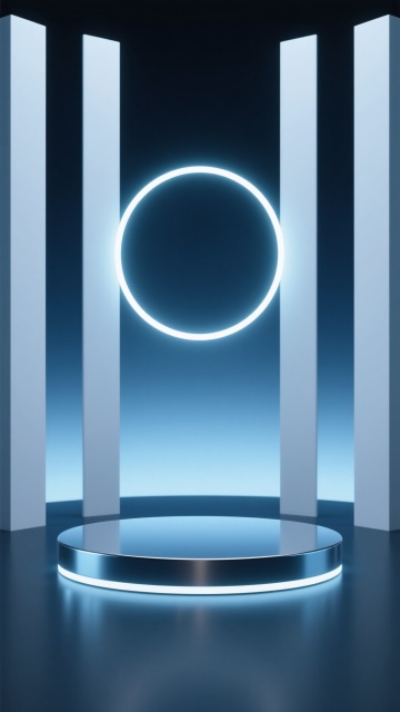 极简风格展台,整体呈现简洁、现代的设计感,圆形展台位于画面下方中央,表面光滑且具有细腻的反光质感,展台边缘线条流畅。背景保留垂直的白色柱体和发光圆环元素,发光圆环悬浮在展台后方中央位置,散发着柔和的光线,光线在背景上形成自然的渐变效果。场景变换为深蓝色渐变背景,营造出沉稳而神秘的氛围,光线颜色调整为淡蓝色,与背景色相呼应,整个画面保持清晰的视觉层级和高效的信息传达,突出展台的主体地位,符合现代简约的设计美学。