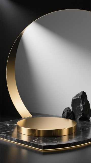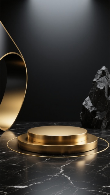 极简高级展台设计,画面中央为圆形金色展台,表面光滑有金属光泽,展台位于深色大理石纹理台面上,台面边缘有金色线条装饰。左侧有黑色与金色渐变的弧形结构,右侧摆放黑色岩石装饰,整体背景为深黑色,营造神秘沉稳氛围。光线从左上方照射,在展台和弧形结构上形成明亮高光和柔和阴影,画面大量留白,黑金配色,极具高级感和设计感,视觉层次分明,信息传达简洁有力。