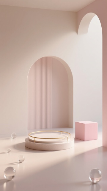 极简主义风格3D渲染,柔和的浅蓝色渐变背景,顶部有流畅曲线构成的白色半弧形装饰,下方是圆形双层台阶式白色展台,展台表面光滑反光,光线从左上方柔和照射,形成轻微的阴影和高光过渡,整体画面干净通透,留白充足,营造出宁静、空旷、简约的空间氛围,无任何文字和装饰元素。