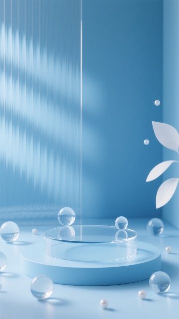 电商商品展台模型底图,几何肌理,浅蓝色系,主体为圆形展台,简洁的几何结构,画面构图和谐,高反光材质,极简风格,留白充足,光线柔和