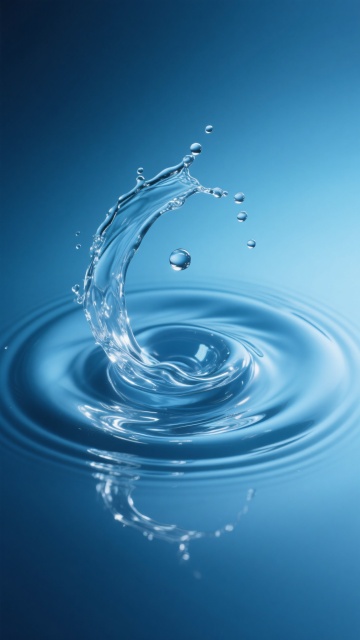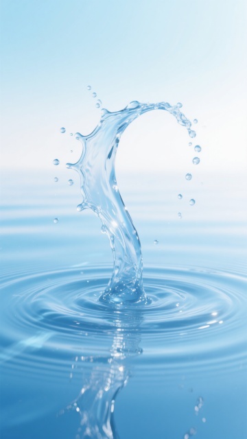超写实摄影风格,纯净透明的液态水以优雅的环形涟漪形态从平静水面扩散开来,中心区域形成柔和隆起的水弧,边缘点缀细小飞溅的水珠与气泡,整体呈现出轻盈灵动的动态美感。背景为渐变的浅蓝色调,光线从上方柔和洒落,在水面形成细腻的高光反射与通透的阴影层次,水的质感清澈见底,波纹线条流畅自然,营造出宁静而富有生命力的氛围。
