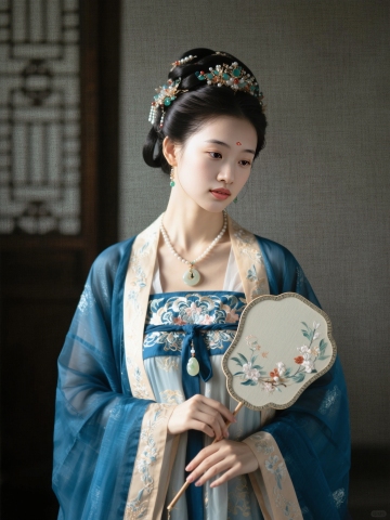 古典中式工笔风,细腻刺绣展现优雅,手持团扇,尽显传统美感。
