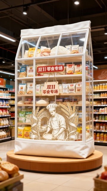 以 “巨型橙金购物车 + 全品类爆款矩阵” 打造视觉爆点,电子产品、潮玩等商品如 “狂欢瀑布” 迸发,搭配 “双 11 爆款区” 强势导购标识,在超市场景中构建沉浸式消费磁场。该创意以 3D 卡通化的强视觉冲击,精准戳中消费者购物欲,既能拉动线下流量转化,更能凭借画面的传播裂变属性,助力品牌在双 11 营销战中突围,实现品牌声量与销售业绩的双向飙升,为咱们的促销战役打造一张 “吸睛又吸金” 的差异