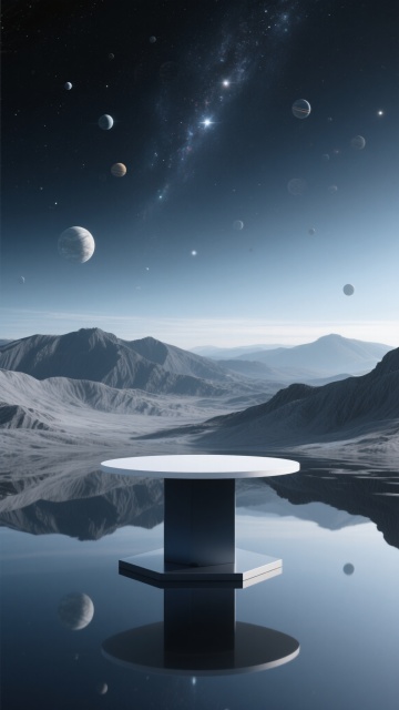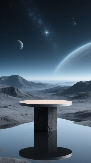 深邃宇宙星空背景,点缀着朦胧星球与闪烁星辰,地平线上是起伏的灰色山峦地貌,表面有细腻纹理,光线从地平线柔和渐变,营造神秘幽静氛围。画面中央是一个展台,展台由黑色基座和光滑的浅色台面组成,台面边缘呈弧形,基座有粗糙质感,整体设计简约现代,展台下方有水面倒影,与星空和山峦形成和谐的科幻场景,整体色调以深蓝、灰色为主,光影过渡自然,具有高级3D渲染的细腻质感和空旷辽阔的视觉效果。