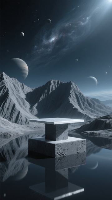 超写实3D渲染风格的科幻场景,深邃的宇宙星空背景,点缀着大小不一的行星和朦胧的星云,前景是覆盖着细密纹理的灰色山峦,山体呈现出自然的风化沟壑,山脚下是平滑如镜的水面,倒映着山体轮廓。画面中央放置一个展台,展台主体为双层结构,下层是带有粗粝质感的深灰色基座,上层是光滑的银白色矩形台面,台面边缘柔和过渡,整体设计简洁大气,与整体冷色调宇宙环境和谐统一。光源来自画面左上方,在展台台面形成明亮的高光,同时在山体上投下长长的阴影,增强画面的立体感和空间深度,营造出神秘、宁静而充满科技感的氛围。