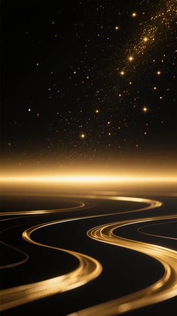 黑金渐变背景,深邃黑色为底,点缀无数金色细小光点如星尘般散布,底部有一条明亮的金色光带横向延展,光带边缘呈渐变模糊效果,下方配有几条流畅的金色曲线装饰,整体营造出神秘而奢华的氛围,光影柔和,色彩和谐统一,具有高端科技感和未来感。