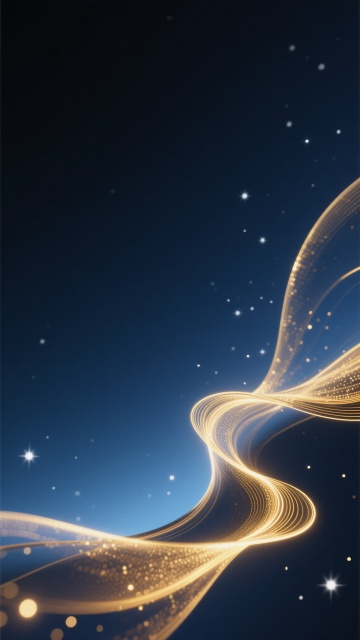 深蓝色渐变背景,深邃夜空般的深色基调,右下角有金色发光线条组成的流动波浪形态,线条细腻且带有闪烁光点,整体呈现出科技感与未来感的抽象流体设计,画面中散布着细小的白色星光粒子,营造出神秘而宁静的氛围,光影柔和,色彩对比鲜明,金色与深蓝色形成优雅的视觉平衡,具有高级感的渐变过渡和光滑的质感表现。
