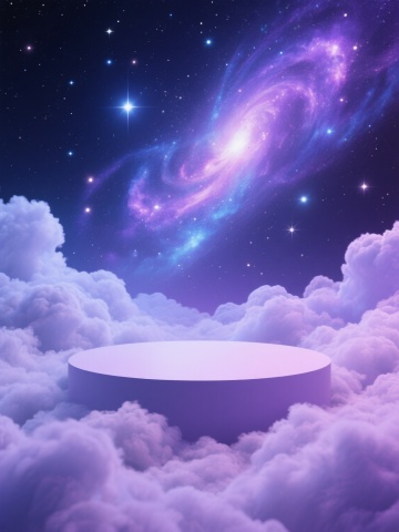 一个光滑的金色圆形展示台,置于深邃的宇宙星空背景下,周围环绕着闪烁的星辰和柔和的星云光晕,光线从展示台底部向上投射,形成神秘而梦幻的光影效果,整体氛围静谧而富有未来感,保持金色金属材质的细腻质感和圆形展台的简洁造型。