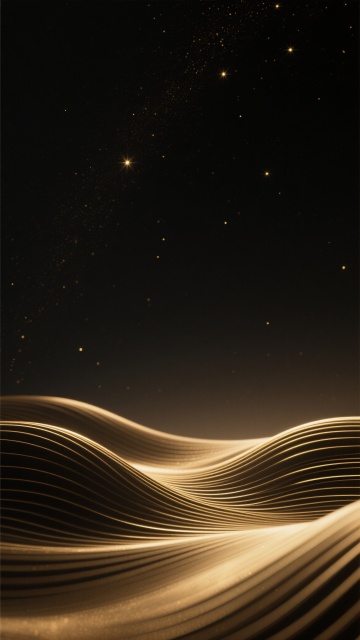 深邃漆黑的背景从顶部到底部平滑渐变为暗金色,营造出神秘而奢华的氛围,画面中点缀着少量细小的金色光点如同遥远的星辰,增添空间深邃感,底部设计有流畅起伏的金色波浪线条,线条边缘带有柔和的高光,呈现出细腻的金属光泽质感,整体构图简洁大气,光影过渡自然,色调统一和谐,充满高级感与静谧的视觉张力。